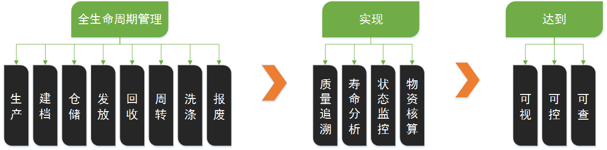 基于RFID内置编码的唯一性,在每件制服上缝制或热烫上一枚RFID洗衣标签,通过提供的RFID终端系统(RFID手持系统、RFID隧道系统、RFID智能工作台等)实现制服入库、投放、收发、洗涤、周转、报废等全生命周期管理。